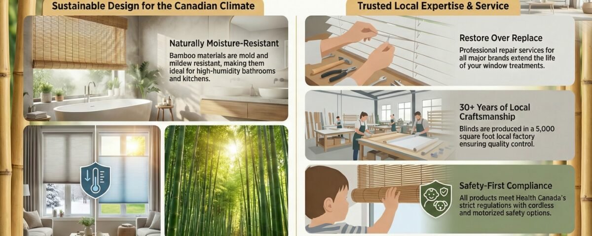 Environmental consciousness matters to Canadian homeowners, and bamboo blinds deliver genuine sustainability benefits. Bamboo is one of the world’s most rapidly renewable resources, growing up to a metre per day without requiring pesticides, fertilizers, or replanting after harvest.