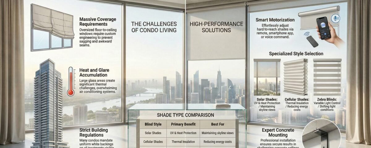 Condo proximity creates privacy challenges that suburban homeowners never face. Neighbouring buildings, street-level visibility, and shared sightlines demand thoughtful solutions that maintain comfort without sacrificing natural light.